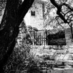 Le soleil de plomb révèle le relief de la pierre sèche et des crépis anciens. Chaque irrégularité d’un mur du XIIe siècle devient une micro-ombre, donnant à l’image une profondeur tactile. Le noir et blanc renforce ce sentiment : on ne voit pas seulement la pierre, on en devine la chaleur et la rugosité.